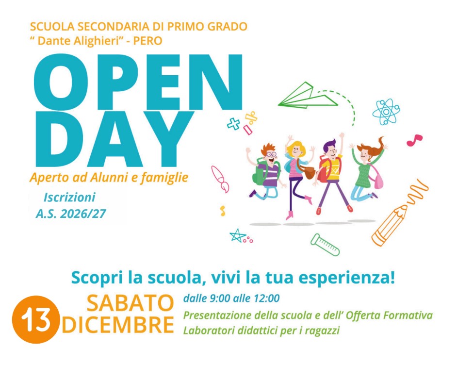 Sabato 13 dicembre, dalle ore 9.00 alle ore 12.00 avrà luogo l’Open Day della scuola secondaria di primo grado “Alighieri”. La mattinata si aprirà in teatro con un incontro di presentazione dell’offerta formativa rivolto ai genitori e laboratori didattici che coinvolgeranno i futuri alunni e che seguiranno per tutta la mattina.